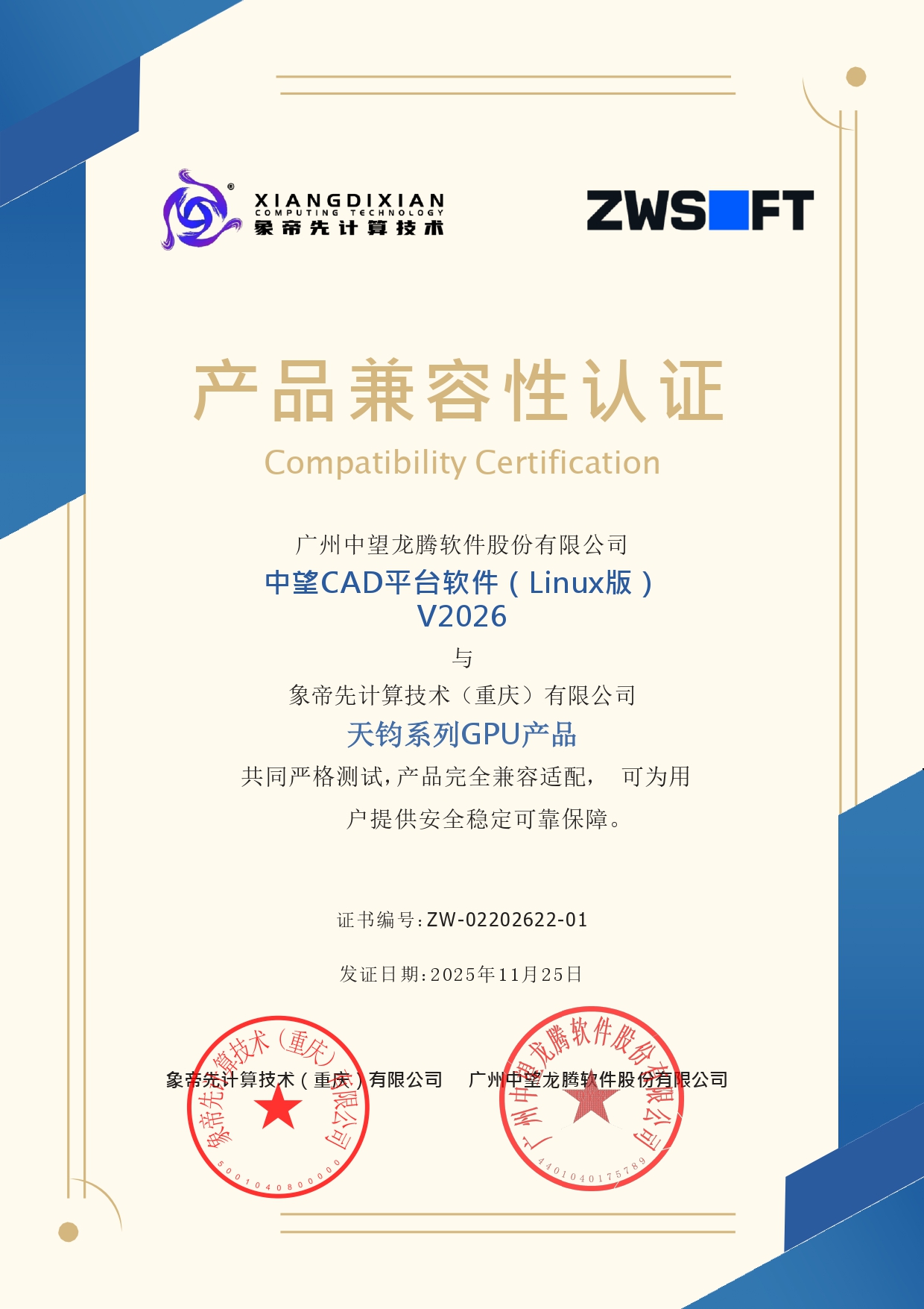 工业软件的高效运行离不开高性能的GPU硬件支撑,2025年,象帝先天钧系列GPU与中望3D平台设计软件(Linux版) V2026、中望CAD平台软件(Linux版) V2026完成兼容认证,该认证经过双方共同严格测试,在基础功能、兼容性、性能和稳定性方面均达到要求。