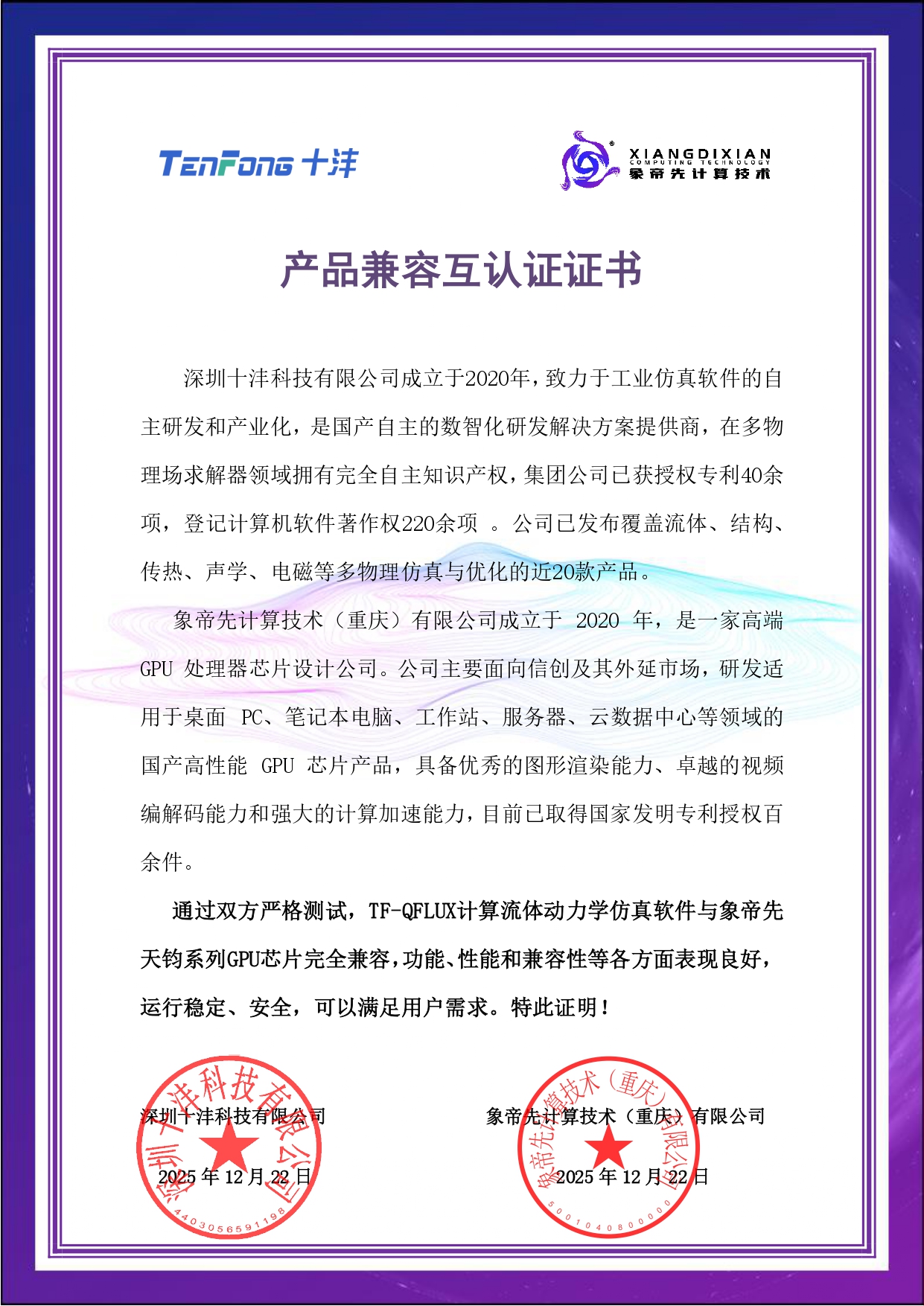 在这一背景下,象帝先计算技术(重庆)有限公司(以下简称“象帝先”)与深圳十沣科技有限公司(以下简称“十沣”)完成产品互认证,并签署战略合作协议。双方围绕国产GPU在工业仿真与工业计算领域的适配与联合优化展开合作,推动国产软硬件解决方案在工业场景中的落地应用。